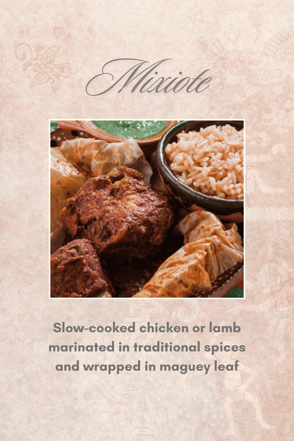 Disfruta del sabor auténtico de la cocina mexicana con nuestro mixiote de carnero, preparado con carne suave y jugosa, marinada en una mezcla de chiles, especias y hierbas aromáticas. Cocido lentamente en hoja de maguey para resaltar su sabor único y tradicional.