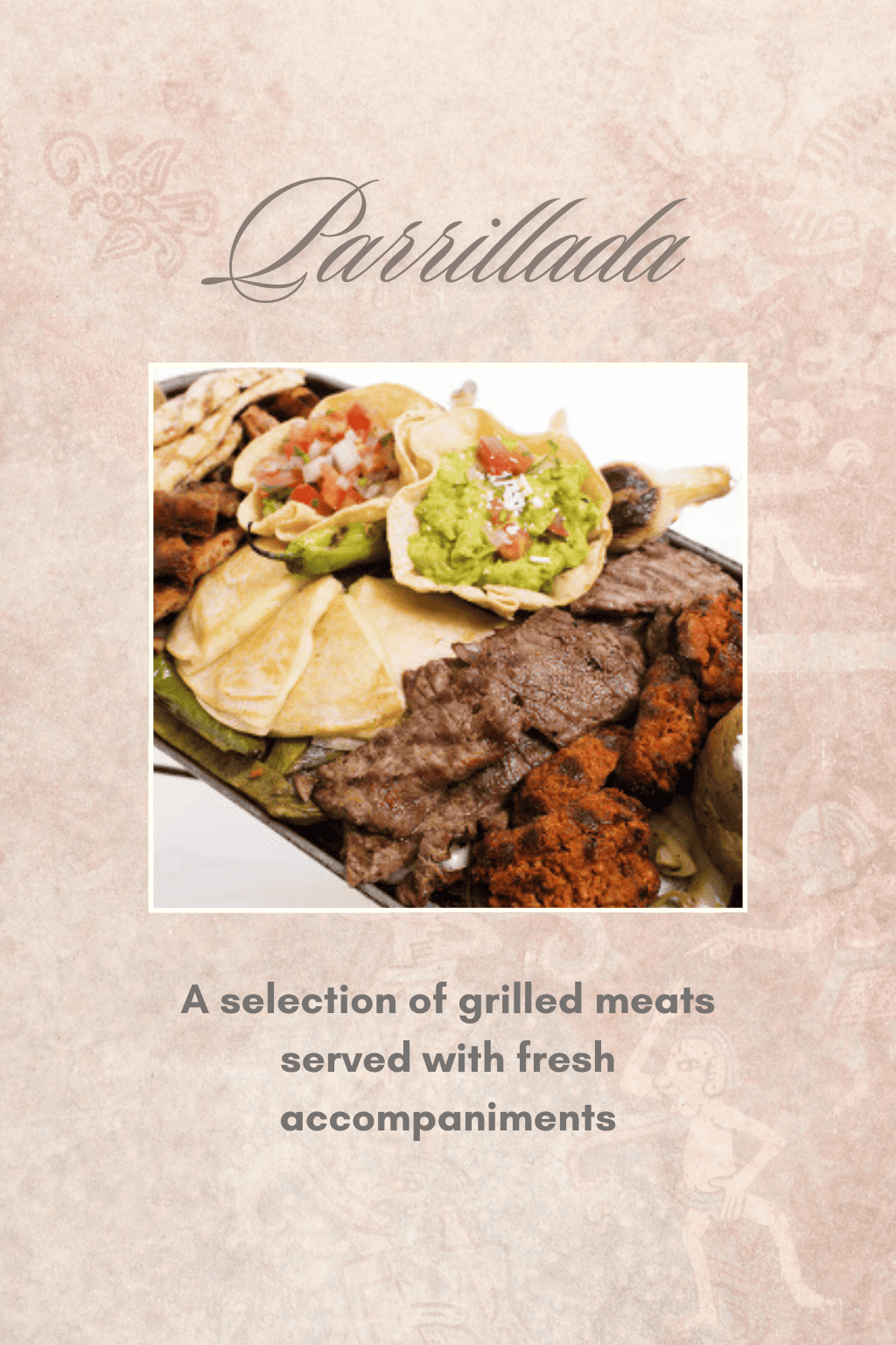 Nuestra parrillada incluye una jugosa combinación de longaniza, bistec de res y pechuga de pollo, todo asado al momento y servido con nopales, cebollitas, papas, guacamole y tortillas calientes.